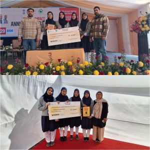 The students-Mantasha Nazir, Eliza Bhat, Hurain Farooq and Pakeeza Hilal, representing NIPS (National Innovative Public School), Zainapora, were honoured under the Startup Idea Challenge for their innovative startup concept titled “Cotton Comfort”, which impressed the jury with its practicality, sustainability, and social relevance.