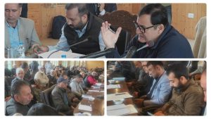 BARAMULLA, APRIL 11: Minister for Agriculture Production, Rural Development and Panchayati Raj, Cooperative and Election Department, Javid Ahmad Dar today chaired a comprehensive review meeting at Dak Bungalow, Rafiabad here to assess the status of irrigation facilities and ongoing developmental works in the area.