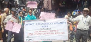 Another awareness programme- cum rally on the theme “Say No to Drugs” was organized at the Main Market Reasi by the Para Legal Volunteers of DLSA. The rally witnessed active participation from members of civil society. The participants carried placards and raised slogans highlighting the need for a drug-free society and urging the youth to stay away from narcotic substances.